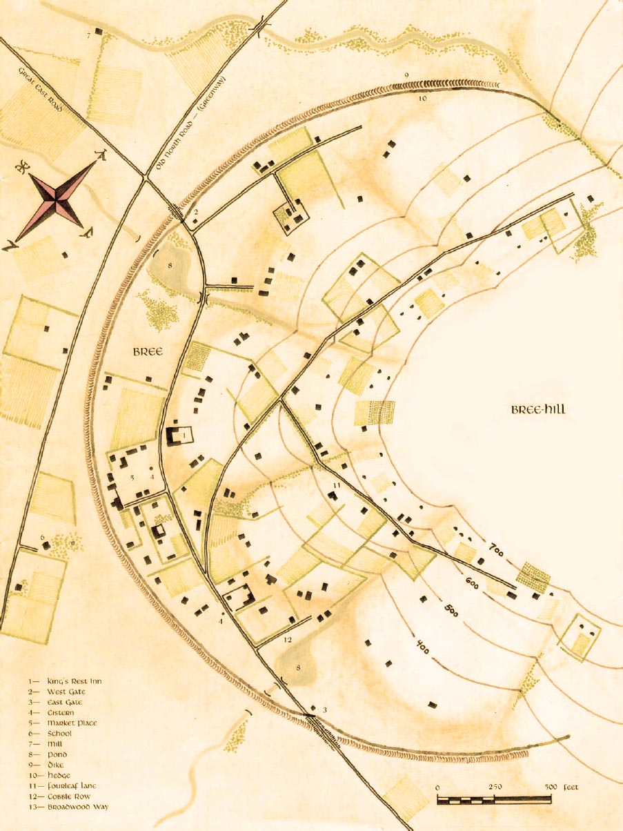 Hauptort des Landes stellt das nur wenige Kilometer große Bree dar, wo sich die Oststraße, deren Beginn bei den Grauen Anfurten liegt, und die Nordstraße (der Grünweg), die in Tharbad beginnt, kreuzen. Bree selbst ist eine der ältesten Siedlungen der aus Westen stammenden Menschen und entwickelte sich seit ihrer Entstehung zu einer Stadt mit lebhaftem Handel und Verkehr. Die Ortschaft besteht aus ungefähr 100 Steinhäusern, die sich an den Hang des Breeberges schmiegen; weiter oberhalb dagegen liegen die Smials der dort sesshaften Hobbits. Zum Schutz der Siedlung errichtete man in einem Halbkreis angeordnet sowohl einen Graben als auch eine Hecke, die von zwei Toren, dem West- und dem Südtor, durchschnitten und entsprechend bewacht wird.